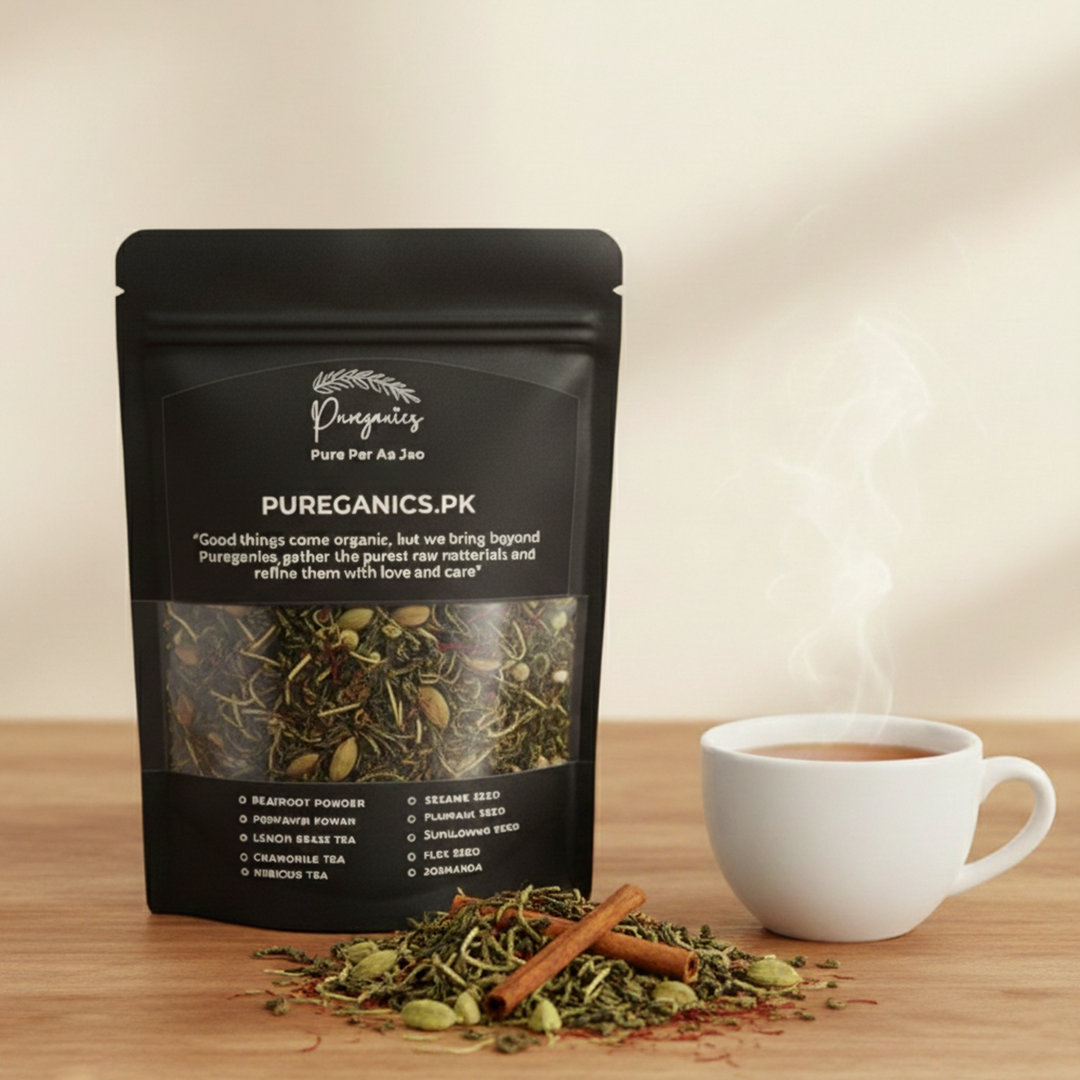 Experience the rich tradition of the Silk Road through the Pureganics Peshawari Kahwa, which happens to be a globally recognized mix of green tea known for its light golden appearance. This tea has been made using high-quality tea leaves of the best green tea available in the world, in addition to a set of natural spices. Like many other types of tea, it has been consumed after the main meals of the day because it helps in digestion, in addition to feeling a refreshing effect on the body.